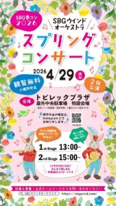 HOME > イベント情報 > 【4/29】SBGウインドオーケストラ スプリングコンサート 2026年4月16日 【観覧無料】SBGウインドオーケストラ スプリングコンサートのお知らせ 主催:SBGウインドオーケストラ(HPはこちら) 開催日時:2026年4月29日(水・祝) 13:00~ / 15:00~ 会場:トピレックプラザ 屋外中央駐車場 特設会場 観覧無料・雨天中止。 ※雨天中止の場合は、SBGウインドオーケストラのInstagramにてお知らせいたします。 Instagramはこちら→ SBG Wind Orchestra(@sbgwind) 詳しくは、以下のポスターをご確認ください。 (タップ・クリックすると拡大します) -イベント情報