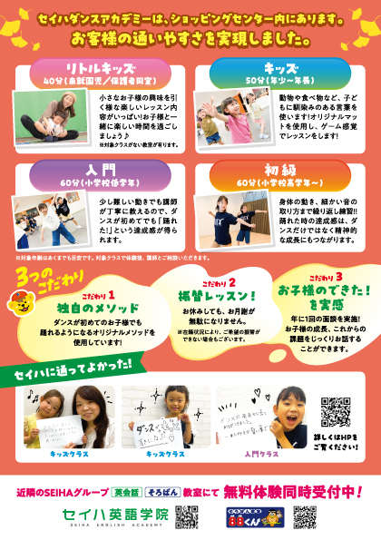 セイハダンスアカデミーのお教室 イオンスタイル南砂3Fという店内に教室があるので、お子様がレッスン中はお買い物ができたりと便利です。 また大きな窓があるのでそこからレッスン風景をのぞいていただいてもOK!お子様も保護者様も安心して通えるスクールです。 |